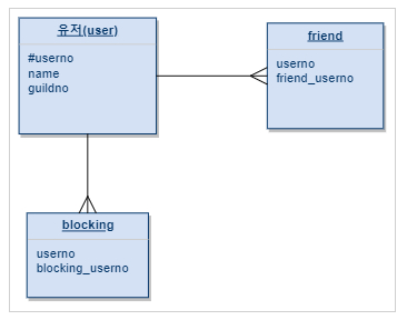 다음과 같이 생긴 모델링을 방사형 모델이라고 하며 친구 유저(friend)와 차단 유저(blocking)를 한 번에 조회하여 각각 몇명이 있는지 조회해 봅시다.