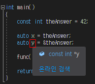 IDE 편집기는 x의 연역된 형식이 int이고 y의 연역된 형식이 const int*임을 표시해 줄 것입니다. 컴파일 가능 상태여야 편집기에서 요청된 개체의 형식을 표시 할 수 있을 것입니다. 간단한 경우에는 IDE가 알려준 정보가 쓸만합니다. 그러나, 복잡한 형식에서는 그리고 도움이 되지 않을 수 있습니다.
