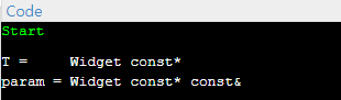 형식을 준수 하려면 이렇게 틀린 보고를 할 필요가 있습니다. 항목 1에서 설명 했듯이 값 전달의 경우 만일 형식이 참조이면 참조성이 무시되며, 참조를 제거 후의 형식이 const이면 해당 const 성 역시 무시 됩니다. vm의 형식이 const auto이므르 &vm[0]는 const widget*이며, param는 const Widget* const&입니다. 참조를 제거한 후의 형식이 const이므로 const 성 역시 무시되어 const Widget*로 보고된 것입니다.