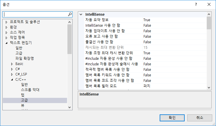 많이 사용되는 편집기인 Visual Studio의 경우를 살펴봅시다. 먼저 옵션에서 C++환경에 대한 IntelliSense 기능이 켜져 있어야 합니다.