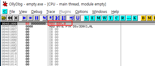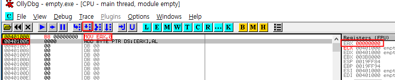 Step Over하여(F8 또는 단축 아이콘 클릭) 수정한 "MOV EAX, 0"을 실행하면 다음과 같이 EAX 00000000으로 변경된 것을 볼 수 있습니다. 왼쪽에 검정색이 한 칸 밑으로 내려 왔으며 검정색 위치가 현재 실행 위치를 의미합니다.