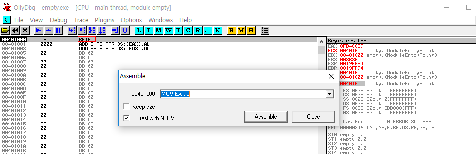 어셈블리어 영역을 마우스 더블 클릭하여 어셈블리 명령어를 입력 할 수 있습니다.