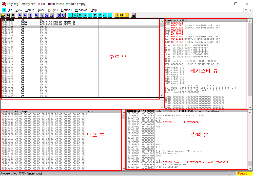 실행 파일을 열면 다음과 같이 로딩되며, 이 화면은 코드뷰, 레지스터 뷰, 덤프 뷰, 스택뷰로 구성되어 있습니다.