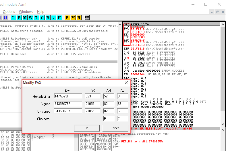 범용 레지스터리 EAX, ECX, EDX, EBX, ESP, EBP, ESI, EDI를 보실 수 있으며 EAX를 더블클릭한 화면입니다.
