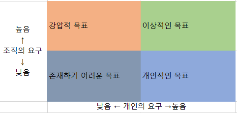 조직의 요구가 낮고 개인의 요구가 크면 자기계발에 해당 하며 반대로 개인의 요구가 낮은데 조직의 요구가 크면 강압적인 목표이며 개인의 요구 또한 높아 질 수 있도록 목표가 잘 정의 되었는지 목표 공유가 잘 되었는지 점검해 보아야 겠습니다.