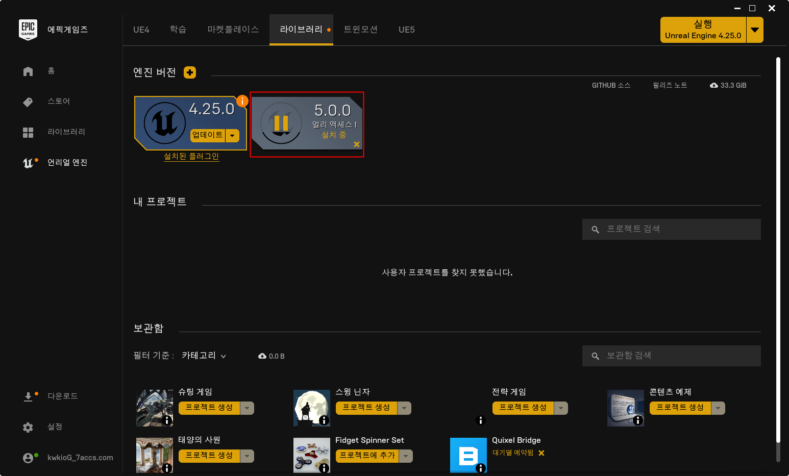 런처를 설치하고 실행하여 Unreal Engine 5를 다음과 같이 설치 합니다.
