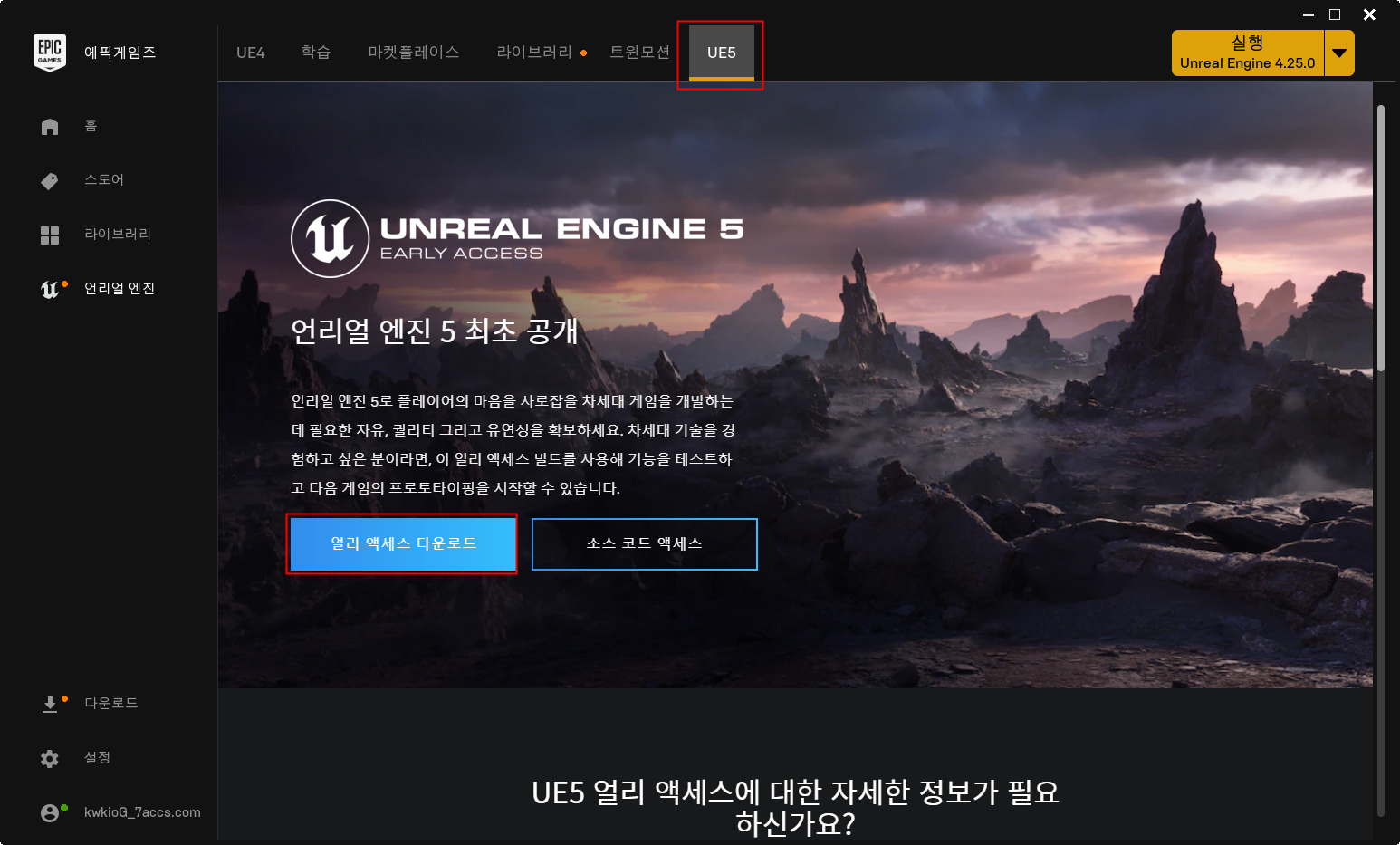 Unreal Engine 5 런처를 다운로드 받습니다.