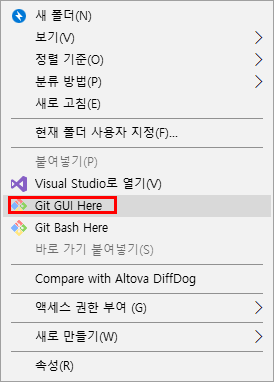 탐색기에서 마우스 우클릭하여 메뉴를 띄운 다음 Git GUI Here를 선택합니다.