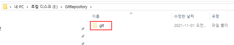 다음과 같이 .git 폴더가 생성 된 것을 확인 할 수 있습니다.(숨김화일 표시 옵션을 켜줘야 보입니다)