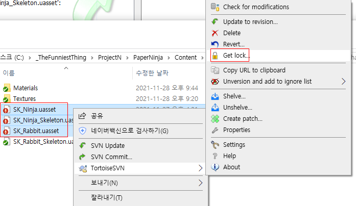 lock을 가져올 원하는 폴더나 파일을 선택한 이후 다음 이미지와 같이 get lock을 합니다.