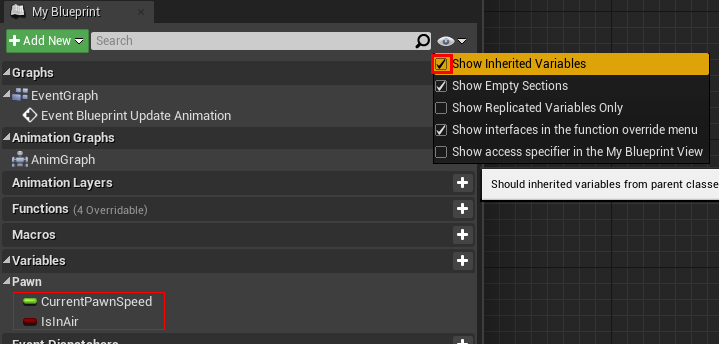 C++ 코드에 다음과 같이 멤버 변수로 CurrentPawnSpeed와 IsInAir가 있습니다.