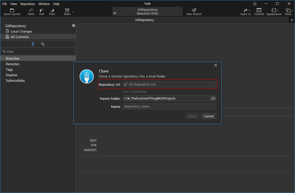 gitlab과 같은 것들과 연동해서 사용하려면 하려면 File -> Clone 메뉴를 선택하여 Repository URL을 입력하여 사용합니다.