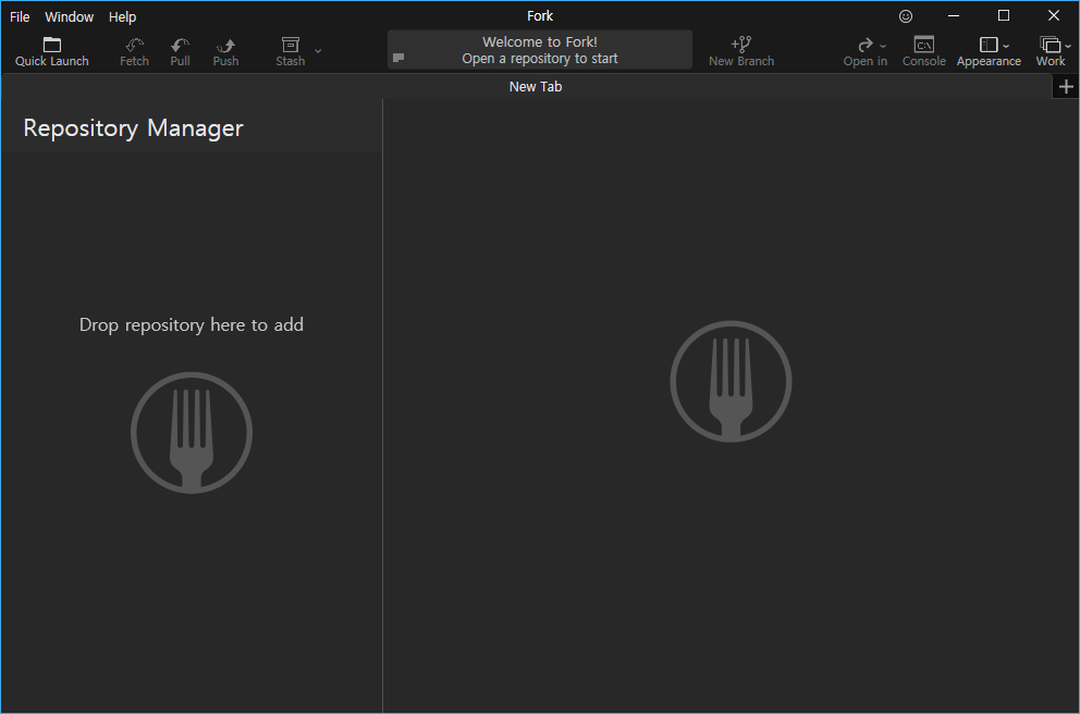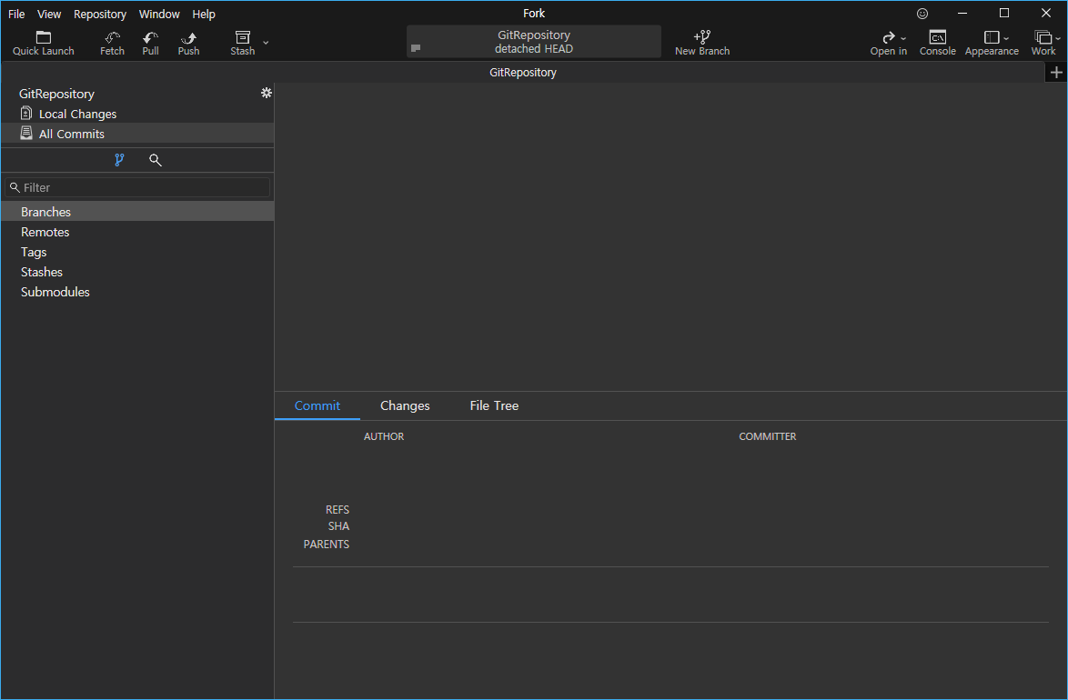 Repository를 생성화면 다음과 같이 Git의 기능들을 GUI로 사용할 수 있습니다.