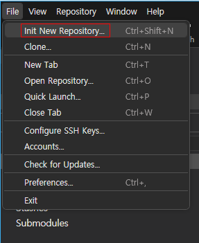 최초로 Git을 시작할때는 Init New Repository를 선택하여 Repository를 만들 수 있습니다.