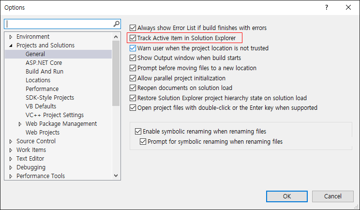 도움 -> 옵션 -> 프로젝트 및 솔루션 -> 일반 -> 솔루션 탐색기에서 활성화된 항목 추적