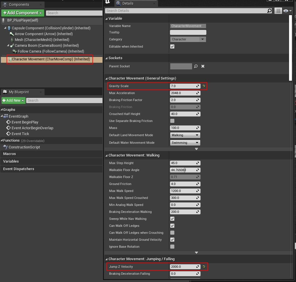 Gravity Scale 값과 Jump Z Velocity의 값에 의해서 점프 높이 또한 조정됩니다.