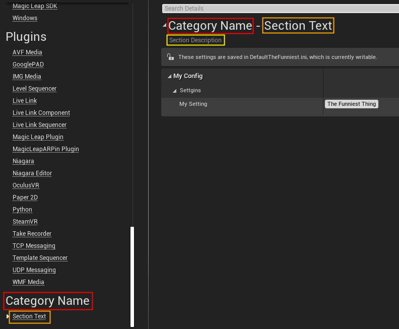 UPROPERTY(EditAnywhere, config, Category = "My Config | Settgins")