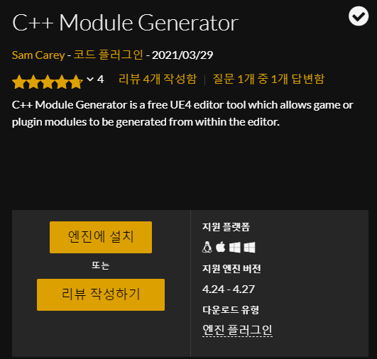 Epic games launcher 마켓에서 C++ Module Generator를 검색하여 설치합니다.