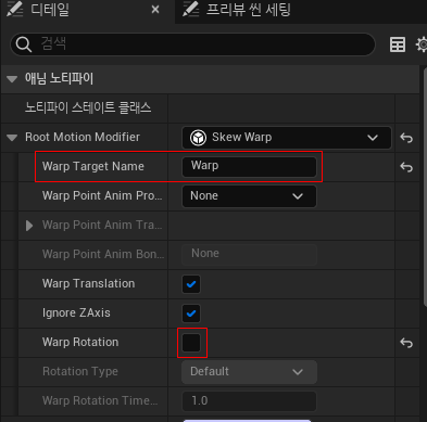 이번 Motion Warping 설정은 Warp Rotation을 비활성화 하여 이동만 하도록 하였습니다.