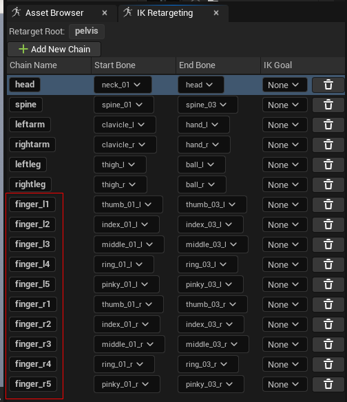 두 IK Rig 파일에 손가락 10개에 대한 Chain을 추가 합니다.