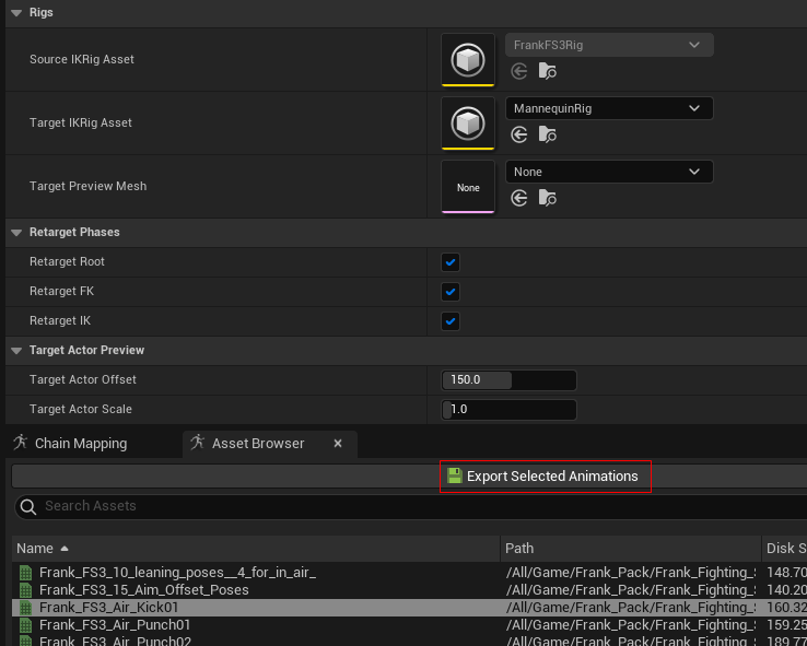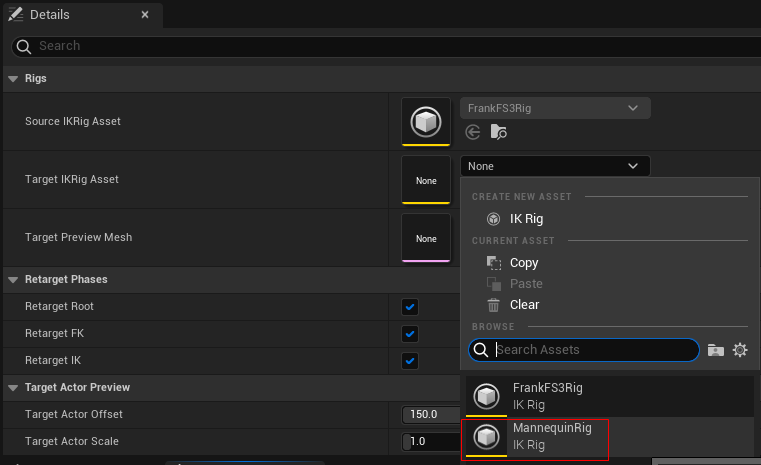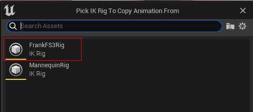 방금 생성한 두 개의 IK Rig가 보이며 소스인 FrankFS3Rig를 선택합니다.
