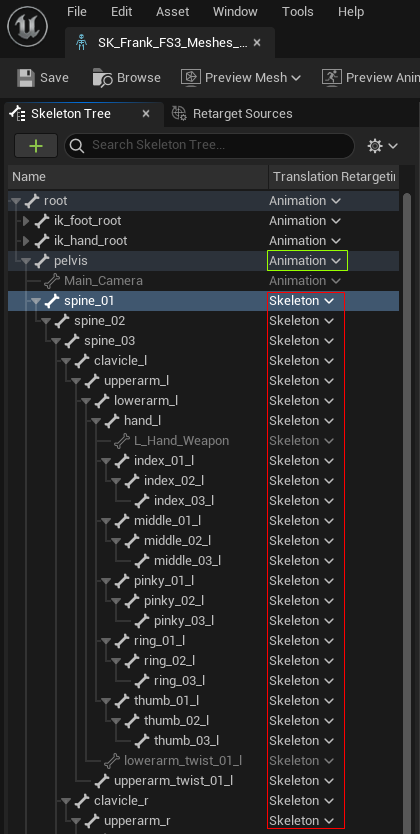SK_Frank_FS3_Meshes_Skeleton를 열어서 동일하게 Retargeting 옵션을 설정합니다.