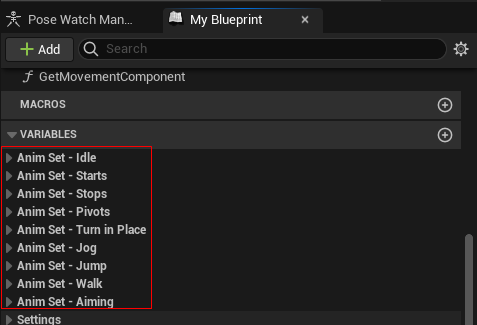 이 변수는 My Blueprint 탭의 "Anim Set - X" 카테고리에서 찾을 수 있습니다.