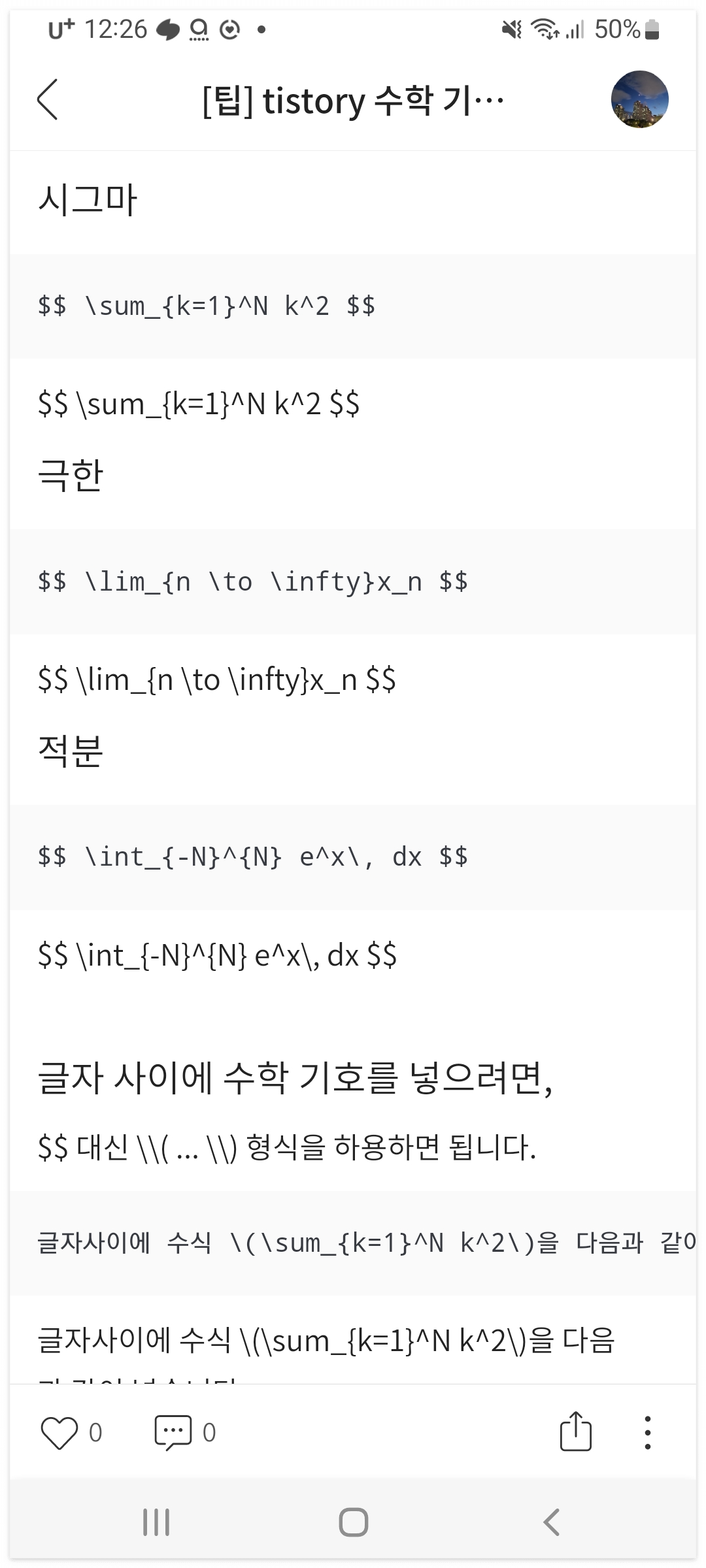 위 방법은 PC에서는 수학 기호가 잘 보이지만 모바일에서 보이지 않기 때문에 다음의 방법을으로 모바일에서도 보이게 할 수 있습니다.