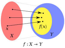 함수 \({\displaystyle f}\)의 정의역 \({\displaystyle X}\), 공역 \({\displaystyle Y}\), 치역 \({\displaystyle f(X)}\)