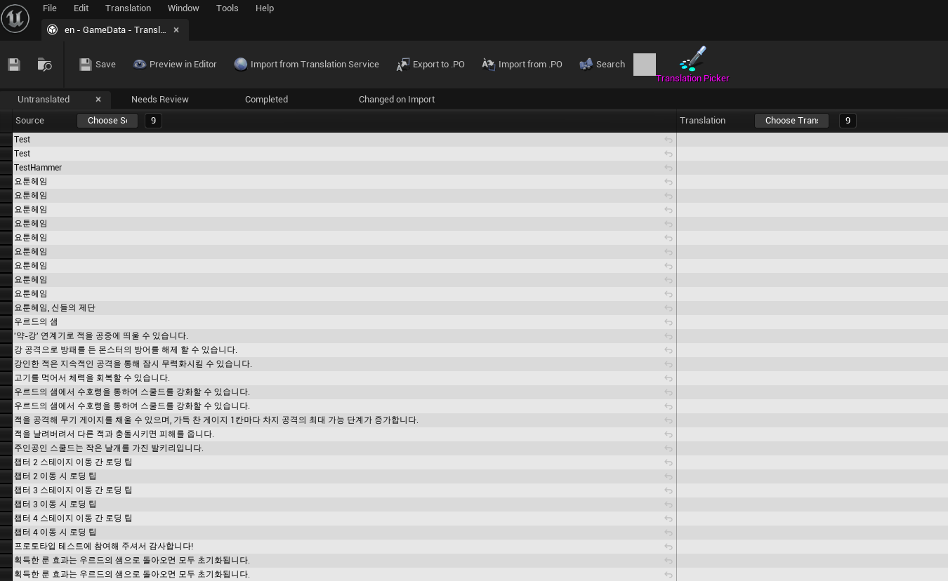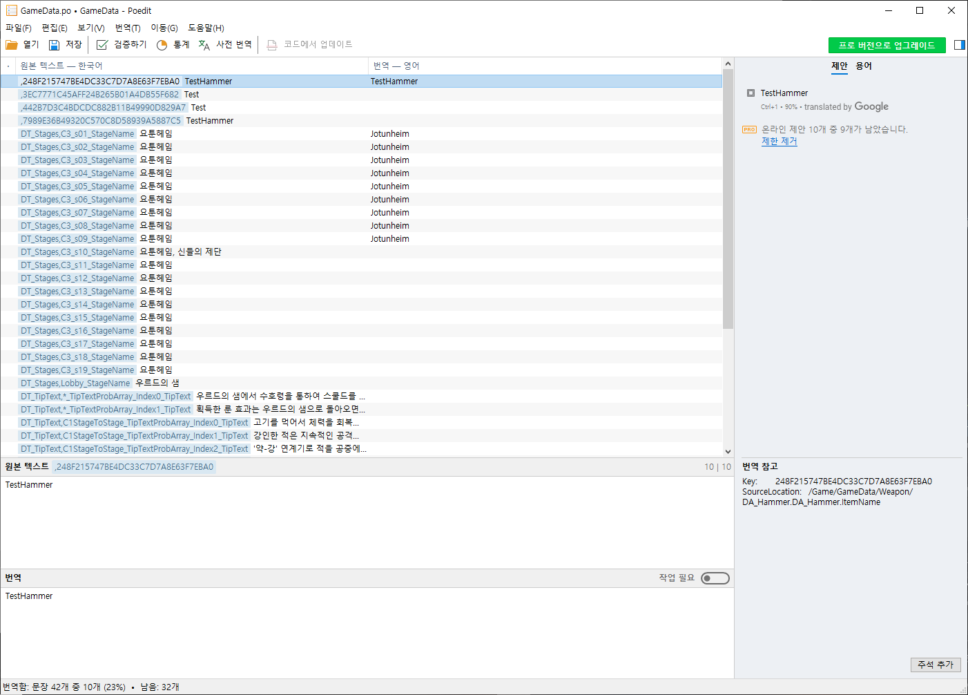 다음은 GameData를 Export한 po 파일을 Poedit로 불러온 모습입니다.