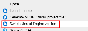 uproject 파일을 우클릭하여 엔진 스위치를 하면 방금 등록한 소스 엔진이 보이며 스위치하여 이 엔진을 사용 하도록 할 수 있습니다.
