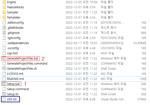 Unreal Engine 소스 코드를 모두 받으면 순차적으로 배치 파일들을 실행합니다.