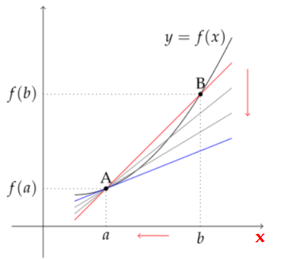 x의 변화량(b-a)를 한없이 작게 만들었을 때 두 점을 연결하는 직선의 기울기가 어떻게 변하는지를 보여줍니다.