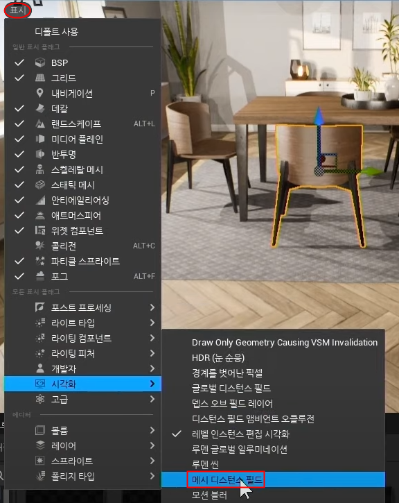 '표시 > 시각화 > 메시디스턴스 필드'를 통해 메시 디스턴스 필드를 시각화 할 수 있습니다.