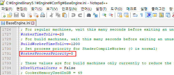 WorkerProcessPriority설정은 이러한 문제를 해결하기 위해 존재합니다. BaseEngine.ini 파일에서 해당 설정을 변경하면, 각 셰이더 컴파일러의 우선순위가 조정됩니다. 우선순위를 높이면 컴파일 속도가 빨라지지만, 다른 작업들의 우선순위가 낮아질 수 있습니다.