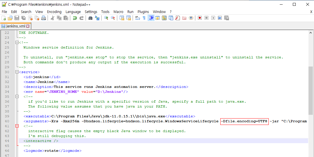jenkins.xml 파일이레 "-Dfile.encoding=UTF8" 추가.