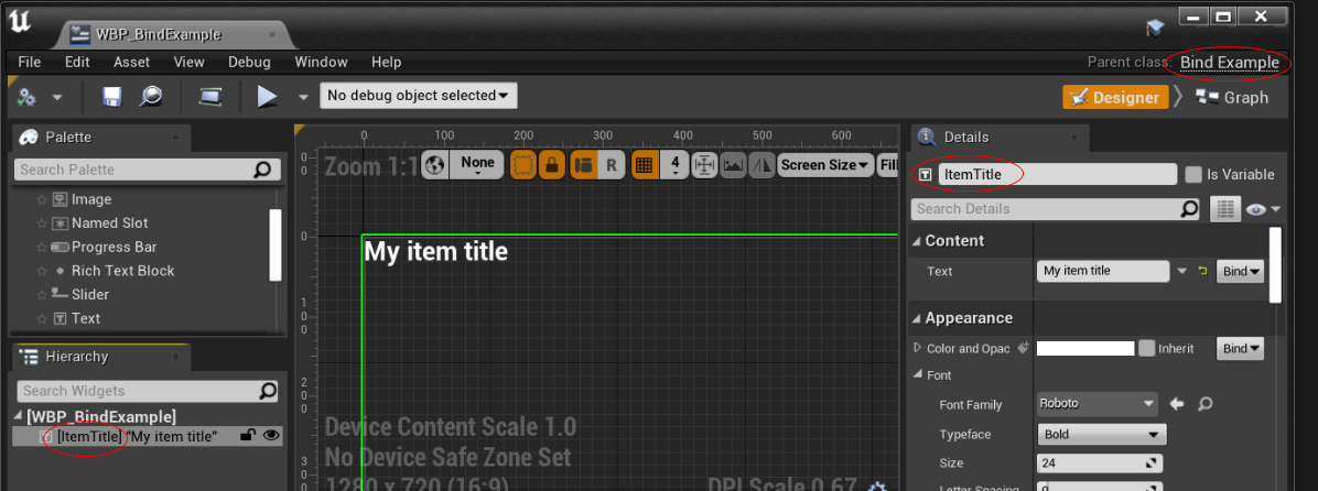 언리얼 에디터에서 UBindExample을 부모로하는 Widget Blueprint를 만듭니다.
