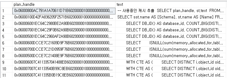 SELECT * FROM SYS.SYSCACHEOBJECTS WHERE [SQL] LIKE '%테이블이름%'