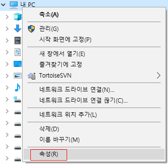 내 컴퓨터 -> 마우스우클릭 -> 속성